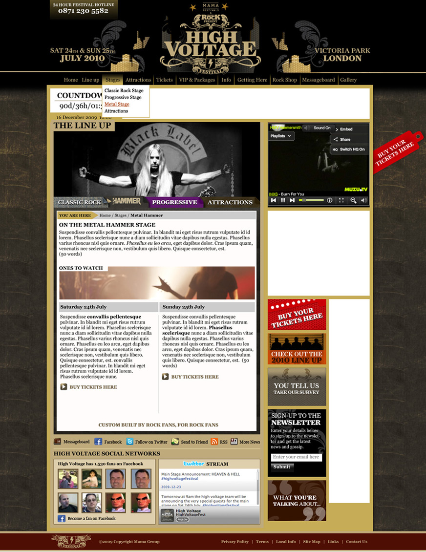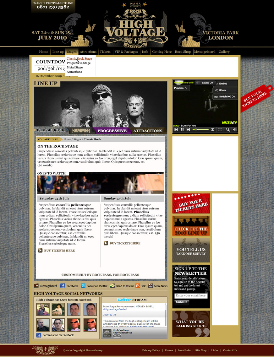 Design and art direction of High Voltage rock music festival website aimed at a 20-40 male audience. The vintage website was based around a four tier stage system, where each stage has its own theme targeting the music genre; Rock, Prog, Hammer.